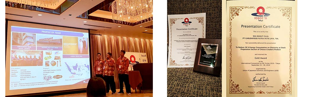 Tema yang diangkat dan dipresentasikan oleh SGA MANUT adalah "Reduce 28 % Energy Consumption on Electricity at Stock Preparation Section of Cheese Crackers Product" secara umum improvement yang dilakukan adalah merubah proses kerja pembuatan Cream Cheese menjadi lebih sederhana tanpa mengurangi kualitas cream sehingga penggunaan energi listrik yang digunakan untuk proses pembuatan cream menjadi lebih rendah 28%. Tema ini sesuai dengan arahan dan kebijakan Perusahaan yaitu tentang Corporate Environmental Policy.