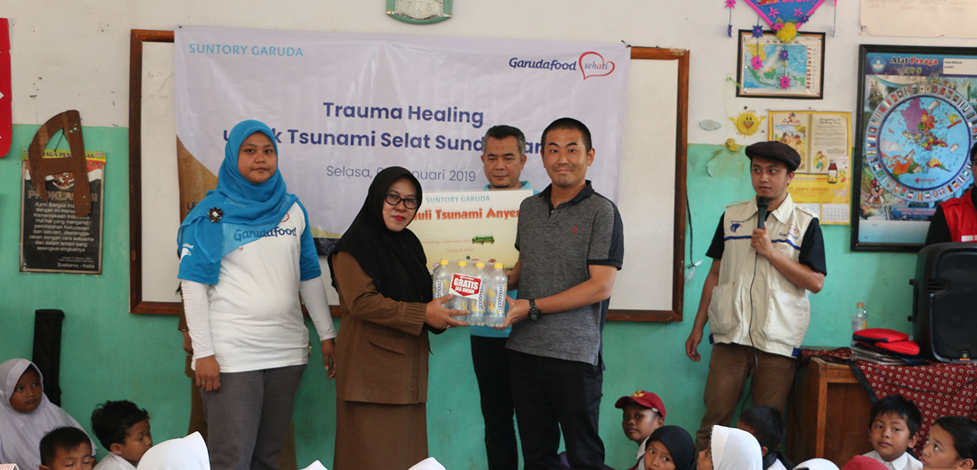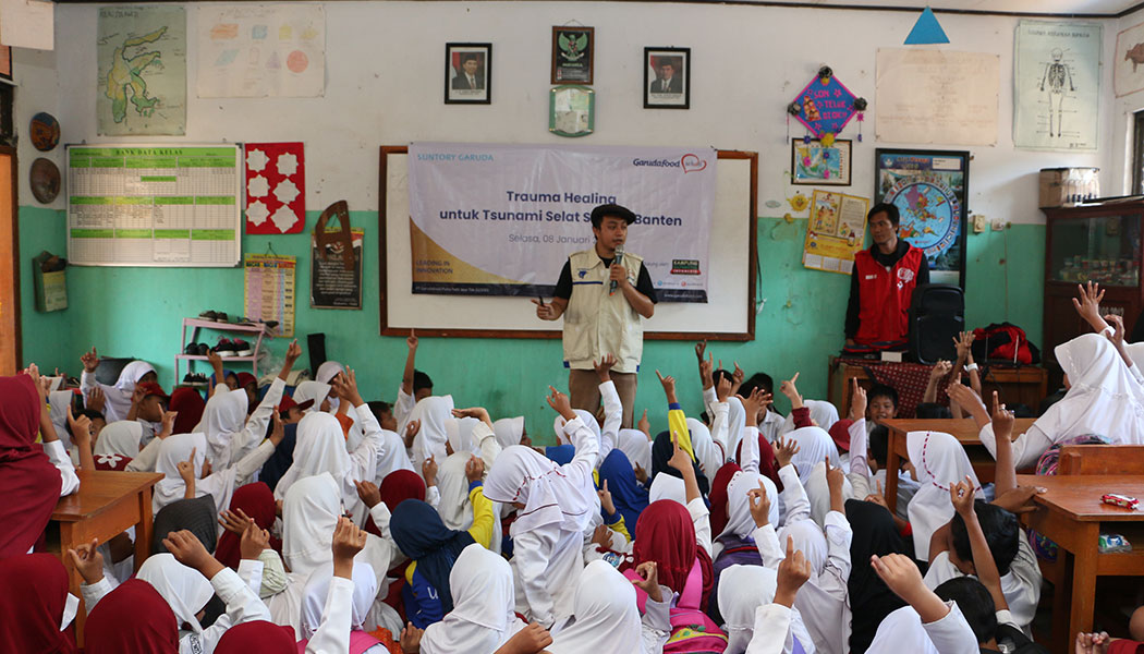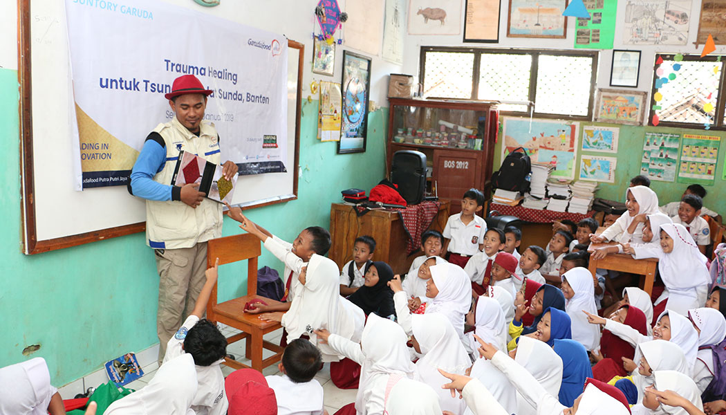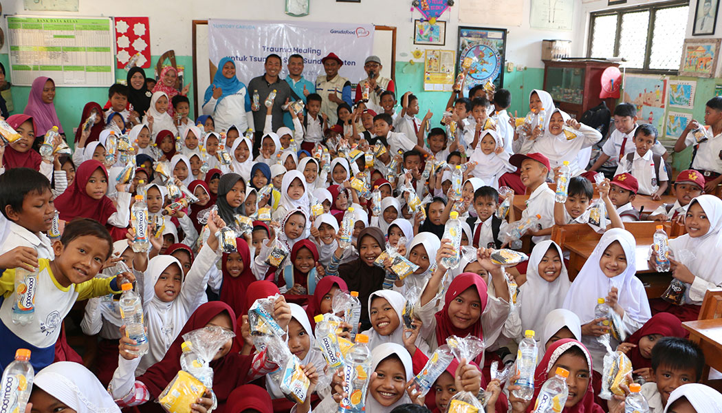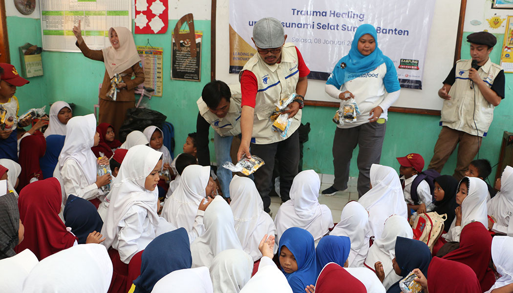 Banten, 8 Januari 2019 - Penghujung tahun 2018 kemarin, Indonesia kembali dilanda bencana Tsunami Selat Sunda yang menelan ratusan korban jiwa serta puluhan ribu rumah rusak bahkan hancur akibat bencana ini. Melihat kondisi tersebut, relawan Garudafood Sehati berkolaborasi bersama Kampung Dongeng Indonesia (KaDo) menyapa anak-anak korban tsunami Selat Sunda dalam bentuk dongeng trauma healing dan bantuan ribuan produk makanan minuman Garudafood dan Suntory di SDN Teluk 01, Banten Jawa Barat (8/1).