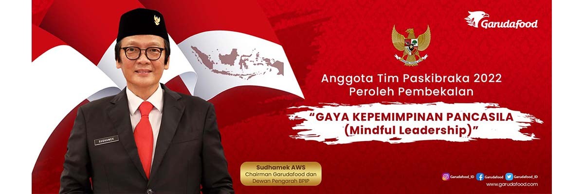 Jakarta, 18 Juli 2022 – Chairman Garudafood sekaligus Dewan Pengarah Badan Ideologi Pembinaan Pancasila (BPIP), Bpk. Sudhamek AWS memberikan pembekalan materi mengenai GAYA KEPEMIMPINAN PANCASILA (Mindful Leadership) kepada 68 anggota tim Paskibraka 2022 dari 34 Provinsi dalam acara Pemusatan Pendidikan dan Pelatihan Calon Paskibraka Tingkat Pusat Tahun 2022 yang diselenggarakan secara Hybrid di Taman Rekreasi Wiladatika Cibubur (18/7). Kegiatan ini berlangung sejak 15 Juli hingga 26 Agustus 2022.