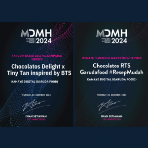 Jakarta, 5 Desember 2024 - PT Garudafood Putra Putri Jaya Tbk (Garudafood) melalui brand Chocolatos berhasil meraih dua penghargaan Marketeers Digital Marketing Heroes 2024 untuk kategori Fandom-Based Digital Campaign Heroes dan Mega Influencer Marketing Heroes. Penghargaan ini diterima langsung oleh Ibu Novyta Dian Kurniawati selaku Senior Brand Manager Chocolatos dan Bapak Irfandi Dwiki Amanda selaku Brand Manager Chocolatos pada penghargaan Marketeers Digital Marketing Heroes 2024 yang berlangsung di Grand Ballroom Hotel Ritz Carlton, Jakarta Selatan.