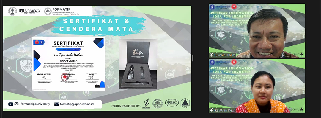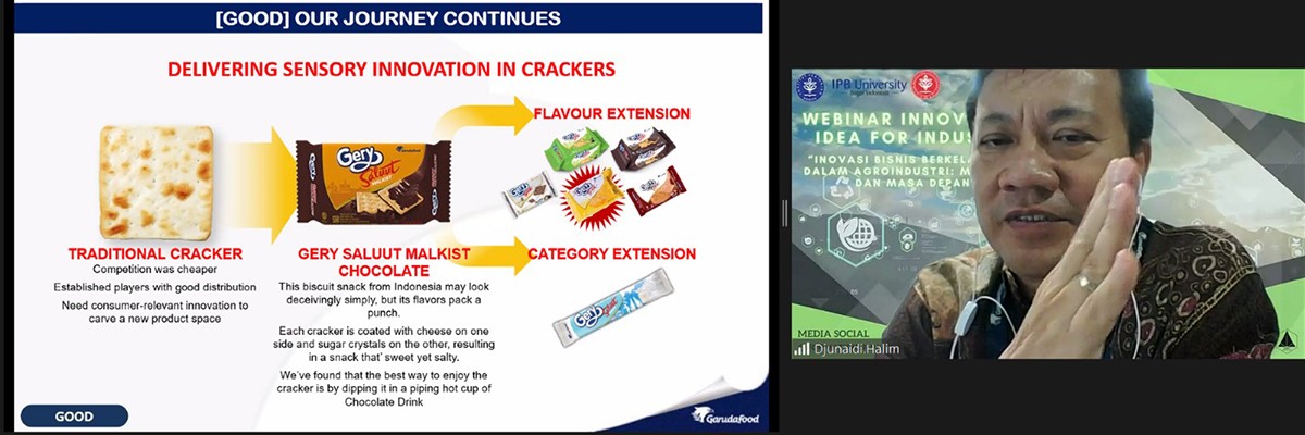Jakarta, 6 Juli 2023 - Bapak Djunaidi Halim (R&D Senior General Manager PT Garudafood Putra Putri Jaya Tbk) hadir sebagai salah satu narasumber dalam acara Webinar Innovation Idea for Industry bertajuk Inovasi Bisnis Berkelanjutan dalam Agroindustri: Masa Kini dan Masa Depan pada hari ini Kamis 6 Juli 2023 secara virtual melalui platform Zoom.