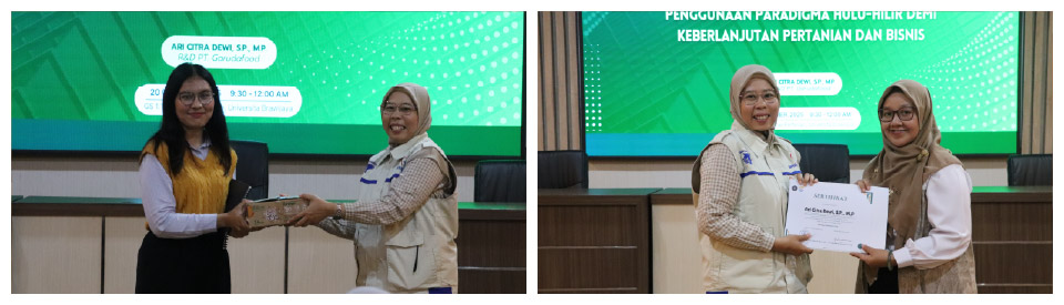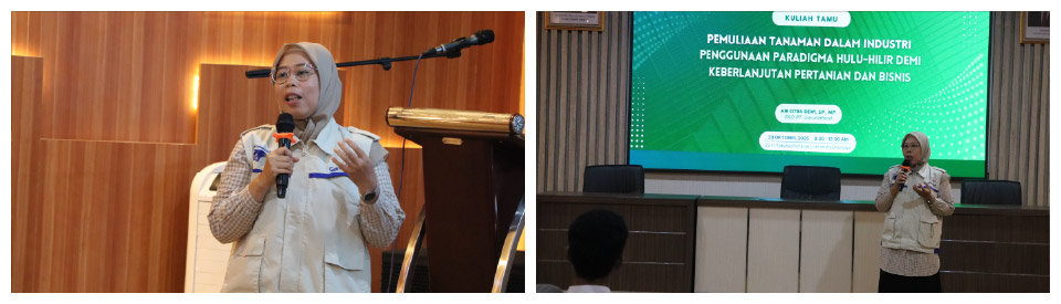 Dalam kegiatan yang berlangsung selama dua hari tersebut, Ibu Ari Citra Dewi, S.P., M.P., selaku R&D Section Head Divisi Farming Garudafood, hadir sebagai pembicara utama dan fasilitator workshop lapang. Beliau membagikan wawasan mengenai pentingnya sinergi antara riset akademik, inovasi bioteknologi, dan kebutuhan industri pangan dalam menciptakan sistem pertanian yang produktif dan berkelanjutan. Pemuliaan tanaman tidak hanya berperan dalam peningkatan produktivitas, tetapi juga menjadi fondasi penting bagi keberlanjutan industri pangan. Melalui pendekatan hulu–hilir, hasil riset dapat diimplementasikan secara nyata untuk mendukung rantai pasok dan pemberdayaan petani.
