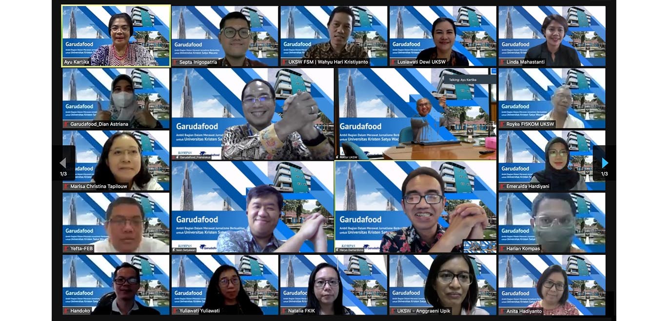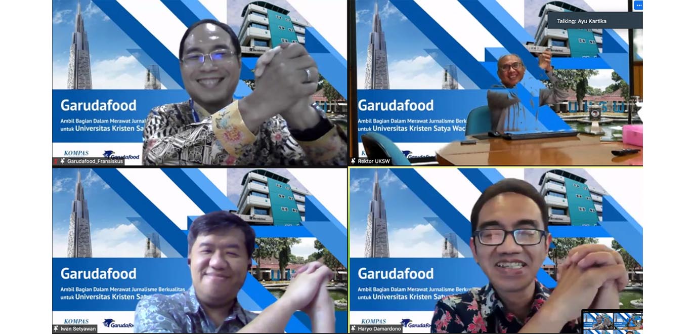 Salatiga, 11 November 2021 - Setelah terselenggara sejak 14 Oktober 2021 yang diawali di Seminari Tinggi Interdiosesan San Giovanni XXIII Malang, hari ini kegiatan Literasi Digital Garudafood Kompas dan seremonial penyerahan bantuan 100 account subscriptions Kompas.id selama 1 tahun kembali digelar bersama Universitas Kristen Satya Wacana (UKSW). Acara ini sekaligus sebagai penutup rangkaian enam kegiatan webinar literasi digital yang dilaksanakan oleh Kompas.id bekerjasama dengan Garudafood dengan topik “Banjir Informasi, Memilih Hoax, dan Fake News”.