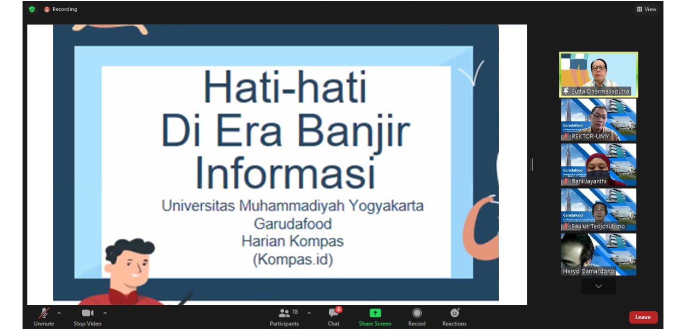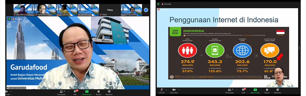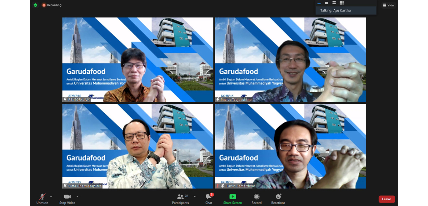 Yogyakarta, 22 Oktober 2021 - Untuk kali ketiga, Garudafood mengadakan seremonial penyerahan bantuan 100 account subscriptions Kompas.id selama 1 tahun sekaligus webinar literasi digital kepada Universitas Muhammadiyah Yogyakarta.