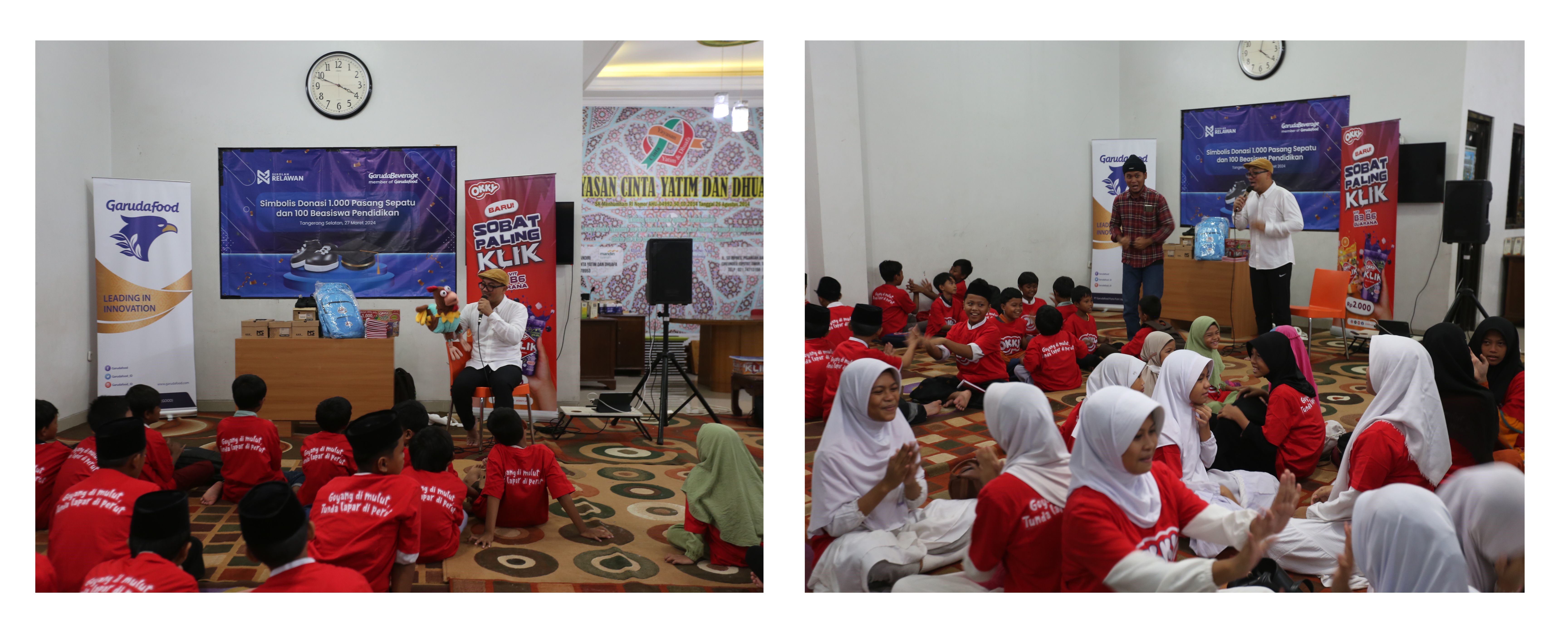 Bermitra dengan lembaga sosial Sekolah Relawan, penyerahan bantuan ini diberikan secara simbolis oleh Presiden Direktur Garuda Beverage sekaligus Direktur Garudafood Bapak Fransiskus Johny Soegiarto didampingi oleh Direktur Komersial Garuda Beverage Bapak Sugeng Suharyono kepada perwakilan 40 anak bertempat di Yayasan Cinta Yatim dan Dhuafa, Tangerang Selatan, Banten.