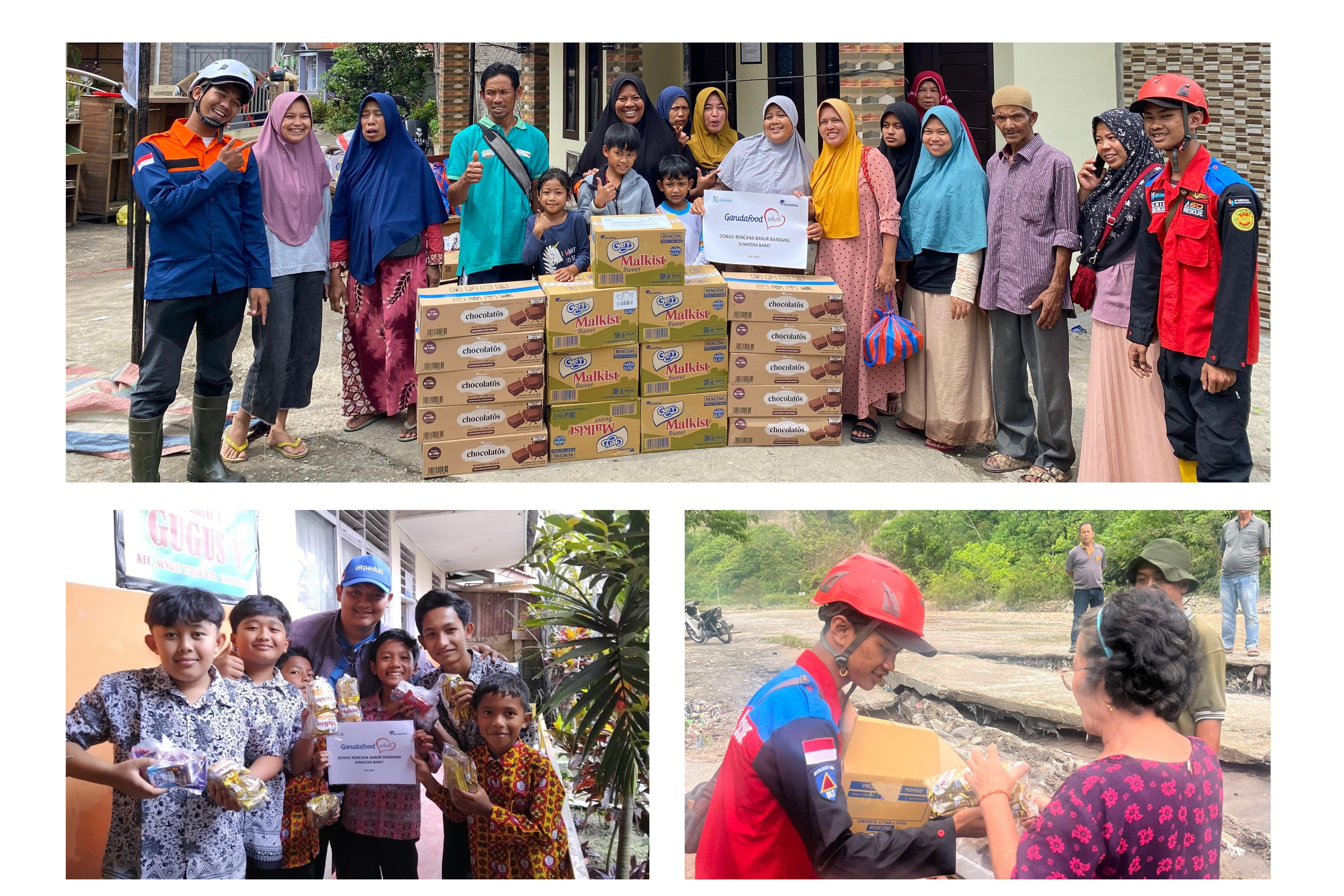 Terkait dengan bencana tersebut, tim Garudafood Sehati dan SNS bergerak cepat menyalurkan lebih dari 120 karton produk Garudafood berupa biskuit malkist dan wafer cream chocolatos kepada para korban bencana alam di beberapa titik posko pengungsian Kabupaten Agam dan Tanah Datar – Sumatera Barat. Selain produk, Garudafood juga menyalurkan bantuan dalam bentuk natura seperti emergency shelter kit (tenda, selimut, alas tidur), perlengkapan kebersihan, obat – obatan dan lain sebagainya melalui mitra DT Peduli. Distribusi bantuan ini dilakukan sejak tanggal 14 Mei 2024 dan saat ini masih terus bergerak berkolaborasi dengan Sekolah Relawan, Daarut Tauhiid (DT) Peduli dan Keluarga Buddhayana Indonesia (KBI) Sumatera Barat.
