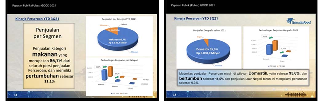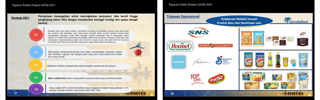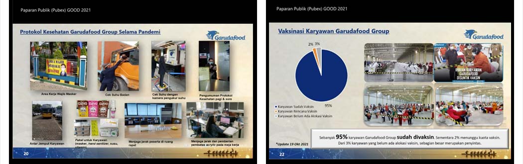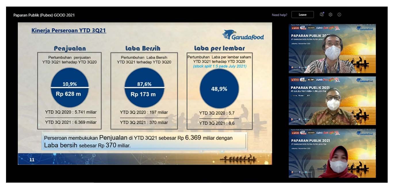 Jakarta, 01 November 2021 - PT Garudafood Putra Putri Jaya Tbk (“Garudafood”) hari ini menggelar paparan publik secara elektronik di kantor pusat Garudafood, Jakarta. Pelaksanaan paparan publik ini dipimpin oleh Bpk. Paulus Tedjosutikno selaku Direktur Garudafood. Agenda paparan publik memaparkan mengenai kinerja YTD 3Q2021 serta kondisi operasional terkini perusahaan.