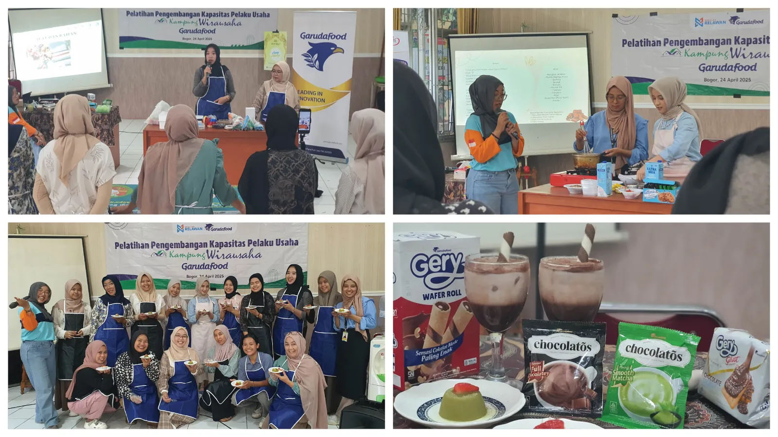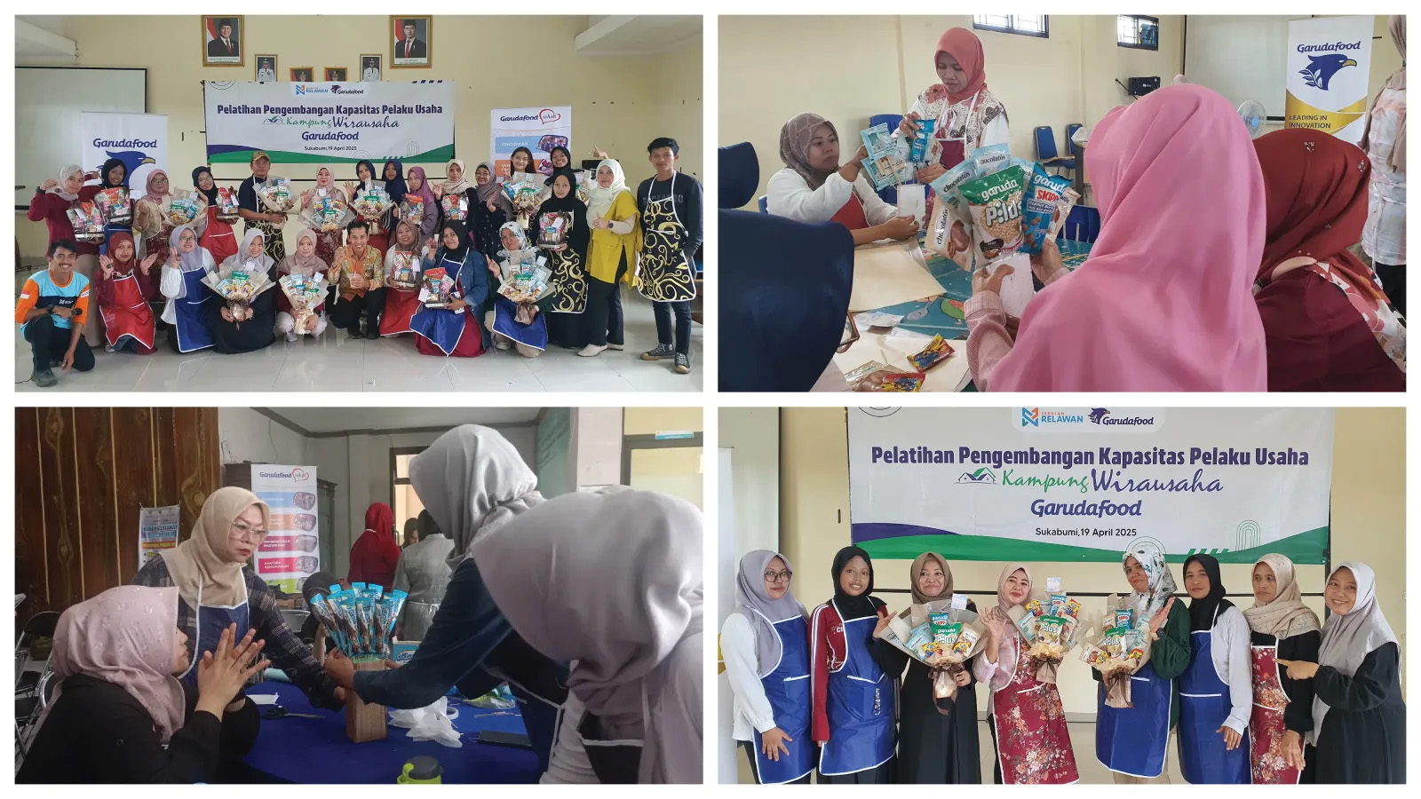 Pelatihan yang diadakan selama bulan April 2025, diselenggarakan oleh Garudafood bermitra dengan Sekolah Relawan di 3 wilayah di Jawa Barat, antara lain di Bogor, Sukabumi dan Cianjur serta dihadiri oleh lebih dari 150 ibu – ibu yang tergabung dalam program Kampung Wirausaha Garudafood dengan berbagai kreasi yang dihasilkan seperti kreasi olahan makanan dan minuman, kreasi hand bouquet dan kreasi parsel produk melalui bimbingan dari narasumber yang mumpuni di bidangnya. Para peserta yang hadir pun sangat antusias dan semangat mengikuti setiap tahapan pelatihan yang diberikan serta merasa sangat bangga dan bersyukur diberikan kesempatan menjadi bagian dari program ini.