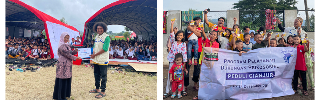 Melihat kondisi yang memprihatinkan tersebut, Garudafood Sehati berkolaborasi dengan Kampung Dongeng Indonesia (KaDo) menggelar kegiatan “PENDAMPINGAN PSIKOSOSIAL GEMPA CIANJUR 2022” melalui kegiatan trauma healing pada 04-13 Desember 2022 di beberapa lokasi titik posko pengungsian di Cianjur dengan jumlah penerima manfaat lebih dari 1.000 orang anak. Kegiatan yang dikemas dalam bentuk dongeng anak, bernyanyi dan bermain keterampilan ini bertujuan untuk membantu meringankan beban psikologis yang muncul pasca bencana terutama pada anak-anak yang terdampak. Harapannya psikologis mereka dapat kembali pulih dan siap beraktivitas seperti semula.