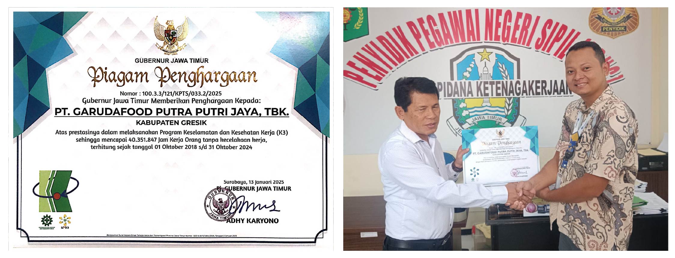 Gresik, 14 Februari 2025 - PT Garudafood Putra Putri Jaya Tbk (Garudafood) Business Unit Gresik kembali meraih dua penghargaan dari Pemerintah Provinsi Jawa Timur. Penghargaan tersebut diserahkan langsung oleh Kepala Seksi Pengawasan & Pembinaan Norma K3, Bapak Amal Fatchulloh, ST, di kantor Disnakertrans Jawa Timur.