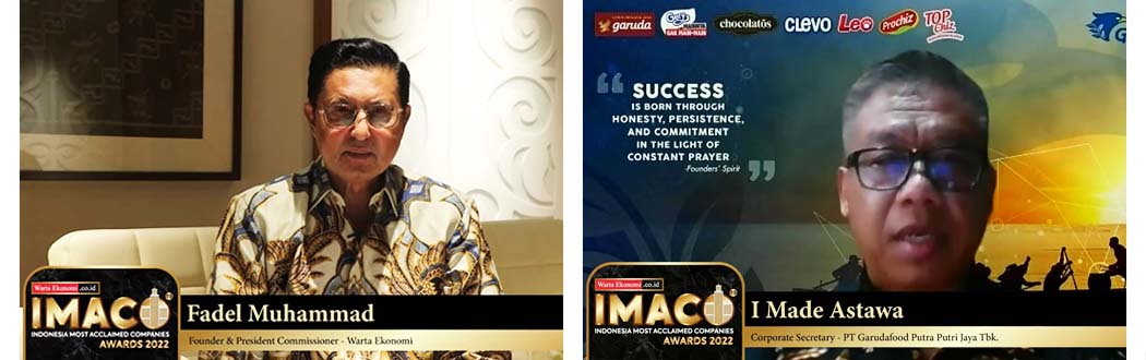 Jakarta, 19 Mei 2022 - PT Garudafood Putra Putri Jaya Tbk (GOOD) kembali meraih penghargaan Indonesia Most Acclaimed Companies Awards 2022: Go Further, Grow Stronger yang diberikan oleh Warta Ekonomi. Acara Awarding dilaksanakan secara virtual pada Kamis 19 Mei 2022 ini dihadiri oleh Muhammad Ihsan (CEO wartaekonomi.co.id) dan Fadel Muhammad (Founder & PresKom WE) serta perwakilan penerima penghargaan. I Made Astawa (Corporate Secretary PT Garudafood Putra Putri Jaya Tbk) secara simbolis menerima penghargaan yang diserahkan oleh Bpk. Edy Nurmansyah selaku Direktur Warta Ekonomi.