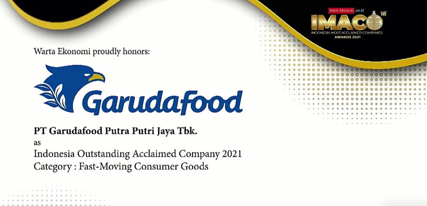 Jakarta, 28 April 2021 - PT Garudafood Putra Putri Jaya Tbk (GOOD) berhasil meraih penghargaan Indonesia Most Acclaimed Companies Awards 2021: “Surviving The Inevitability, Adapting The Anomaly, Seizing The Opportunity” yang diberikan oleh WartaEkonomi.co.id Research and Consulting.