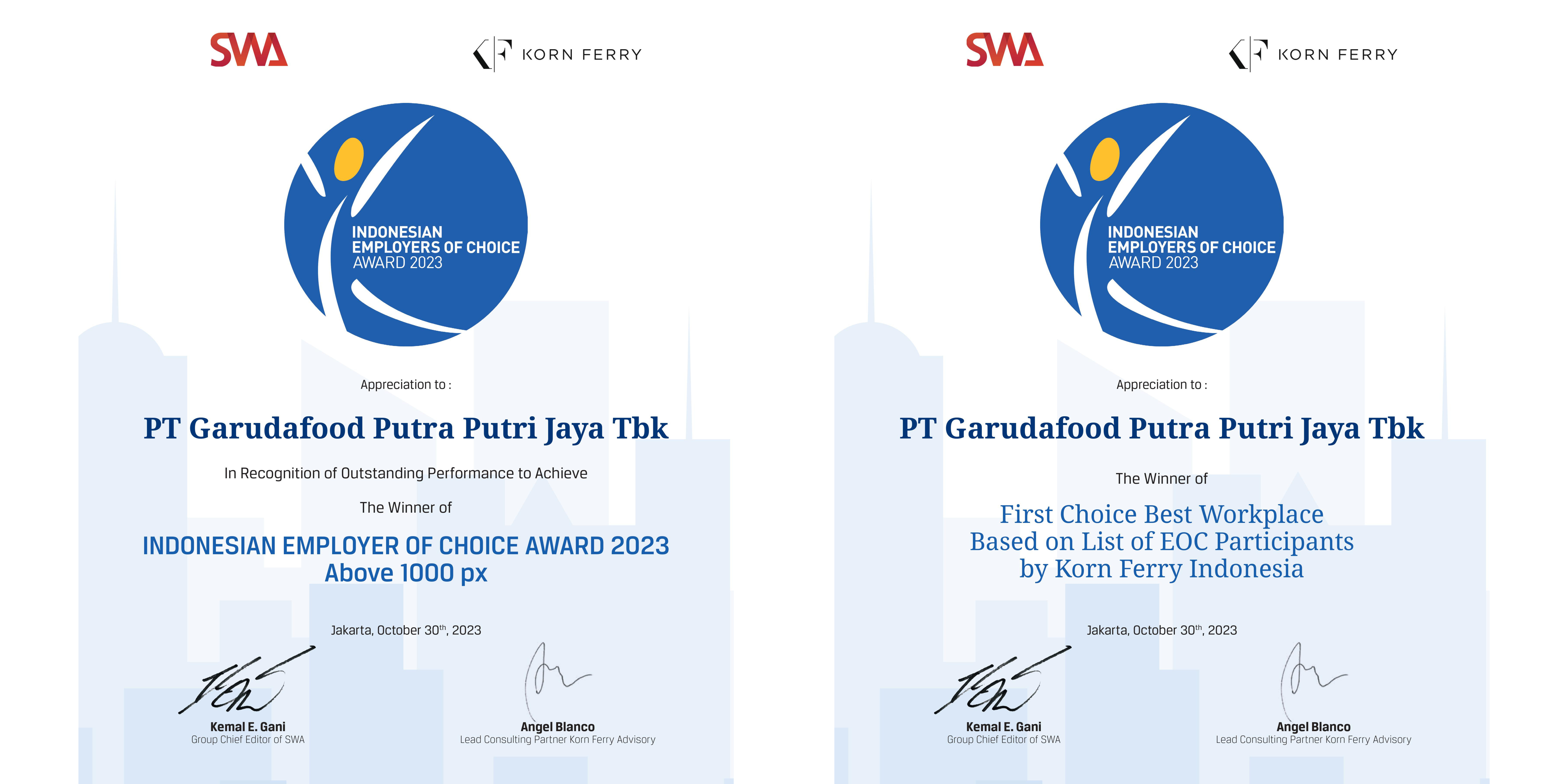 Selamat kepada GARUDAFOOD, semoga dapat terus mempertahankan prestasi yang telah berhasil diraih dan terus menjadi perusahaan yang menawarkan lingkungan kerja yang positif bagi pengembangan dan pertumbuhan karyawannya.