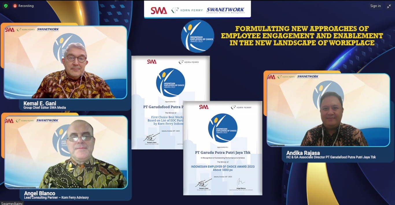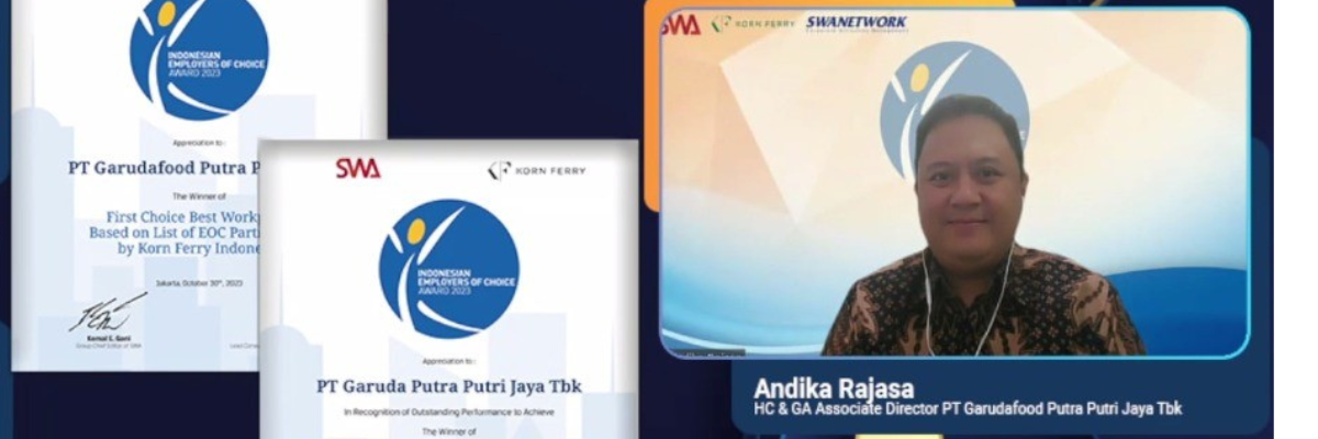 Bapak Andika Rajasa (HC & GA Associate Director PT Garudafood Putra Putri Jaya Tbk) hadir mewakili perusahaan menerima penghargaan yag diberikan oleh Bapak Kemal E Gani (Group Chief Editor Swa Media) dan Bapak Angel Blanco (Lead Consulting Partner – Korn Ferry Advisory) dalam acara yang diselenggarakan secara virtual, Senin 30 Oktober 2023.