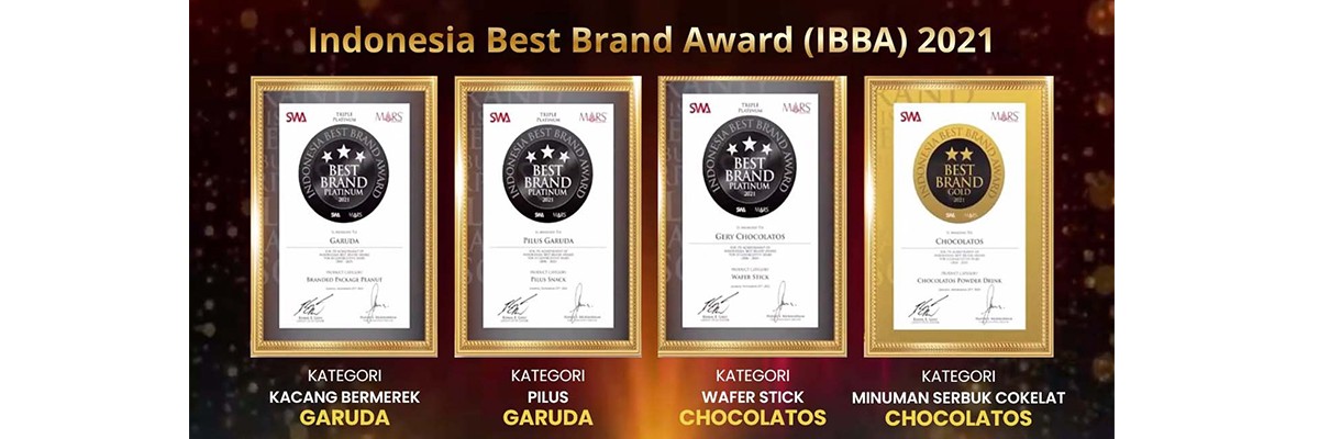Jakarta, 25 November 2021 - Garudafood kembali meraih meraih 4 (empat) penghargaan Indonesia Best Brand Award (IBBA) 2021 melalui 2 (dua) Brand unggulannya yaitu Garuda dan Chocolatos. Penghargaan ini merupakan apresiasi terhadap merek-merek terbaik di tanah air sebagai tolak ukur kinerja merek Indonesia, khususnya di masa pandemi Covid-19 dengan memperhatikan lima variabel penilaian yakni awareness, iklan, brand usage, satisfaction, dan loyalty yang menghasilkan suatu brand value index.