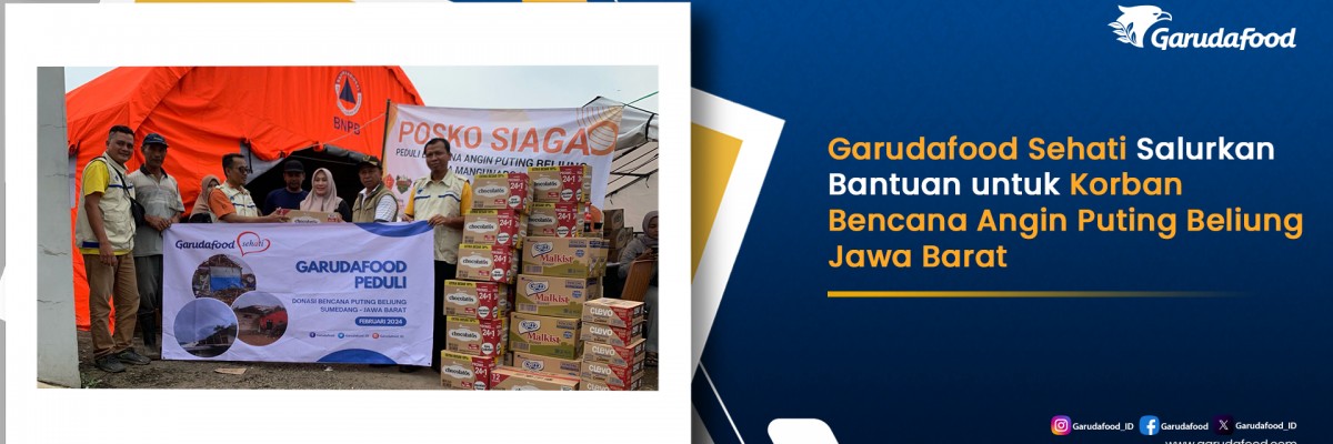 Sumedang, 24 Februari 2024 – PT Garudafood Putra Putri Jaya Tbk (Garudafood) Business Unit Sumedang telah mendistribusikan sejumlah bantuan berupa sembako, sandang, makanan minuman siap konsumsi, dan ratusan karton produk Garudafood kepada karyawan pabrik Garudafood Sumedang dan masyarakat sekitar yang terdampak cukup parah akibat musibah angin puting beliung yang terjadi pada Rabu (21/2). Bantuan disalurkan ke beberapa posko seperti Posko Situ Buntu, Posko Bojong Bolang 1 & 2 serta melalui Yonif 330 dan Dalmas Polda yang berlokasi di Kecamatan Cimanggung, Kabupaten Sumedang – Jawa Barat. Agar bantuan dapat didistribusikan secara merata, selain dilakukan secara mandiri, Garudafood juga berkolaborasi dengan mitra Daruut Tauhid Peduli (DT Peduli) untuk menyalurkan produk biskuit dan susu kepada warga terdampak di wilayah Kabupaten Sumedang dan Kabupaten Bandung.