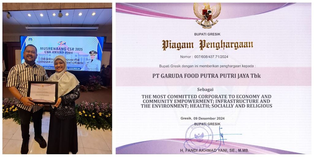 Gresik, 18 Desember 2024 - PT Garudafood Putra Putri Jaya Tbk  (Garudafood) unit bisnis Gresik, Jawa Timur menerima penghargaan sebagai “The Most Committed Corporate to Economy and Community Empowerment; Infrastructure and The Environment; Health; Socially and Religious” yang diberikan oleh Pemerintah Kabupaten Gresik melalui Badan Perencanaan Pembangunan Daerah (Bappeda) Kabupaten Gresik dalam acara Musyawarah Perencanaan Pembangunan (Musrenbang) Corporate Social Responsibility (CSR) tahun 2025. Acara yang diselenggarakan di aula Mandala Bhakti Praja, Kantor Bupati Gresik ini sekaligus  menjadi ajang penghargaan CSR Award 2024.