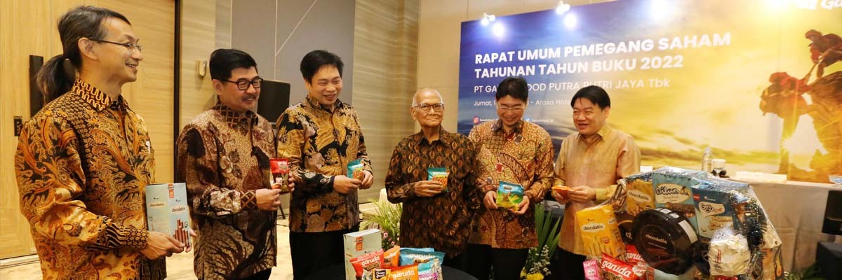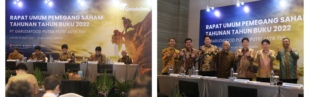 Jakarta, 14 April 2023 - PT Garudafood Putra Putri Jaya Tbk (“Garudafood”) dengan kode saham “GOOD” hari ini mengadakan Rapat Umum Pemegang Saham Tahunan (RUPST) bertempat di Hotel Arosa dan pada siang harinya dilanjutkan dengan agenda Paparan Publik yang dilakukan secara daring di kantor pusat Garudafood, Jakarta Selatan (14/4). Pelaksanaan RUPST ini dipimpin oleh Hartono Atmadja selaku Komisaris, Dorodjatun Kuntjoro-Jakti selaku Komisaris Independen, Hardianto Atmadja selaku Direktur Utama, Paulus Tedjosutikno dan Robert Chandrakelana Adjie selaku Direktur.