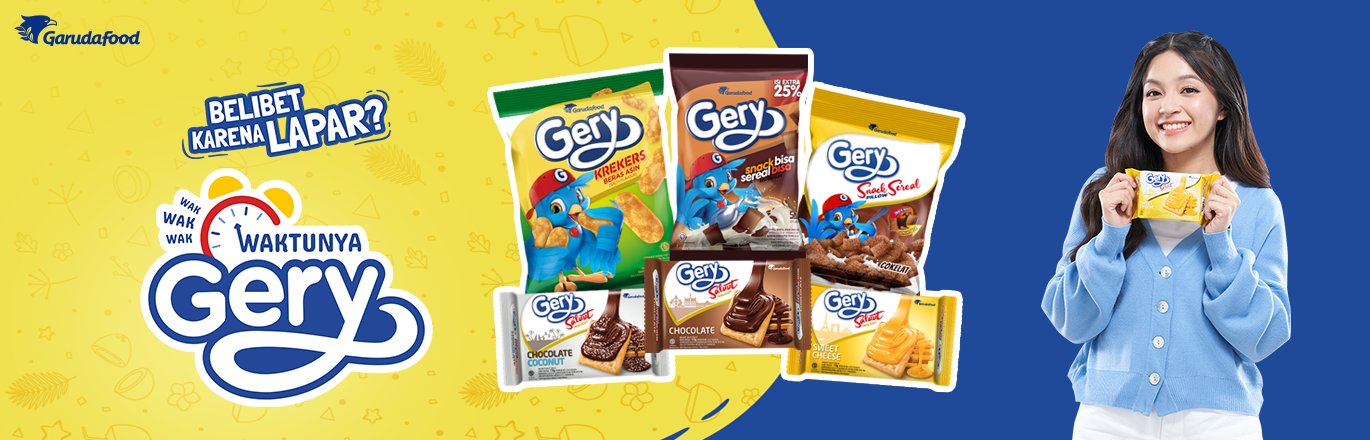 Gery, brand yang sudah mendampingi masyakarat Indonesia selama 24 tahun. Kini hadir sebagai solusi tepat untuk mengganjal lapar di jam-jam nanggung. Dengan berbagai pilihan produk seperti enrobed malkist, enrobed wafer, wafer roll, snack sereal, dan Gery Confectionery, Gery siap menemani setiap momen lapar yang datang tak terduga.