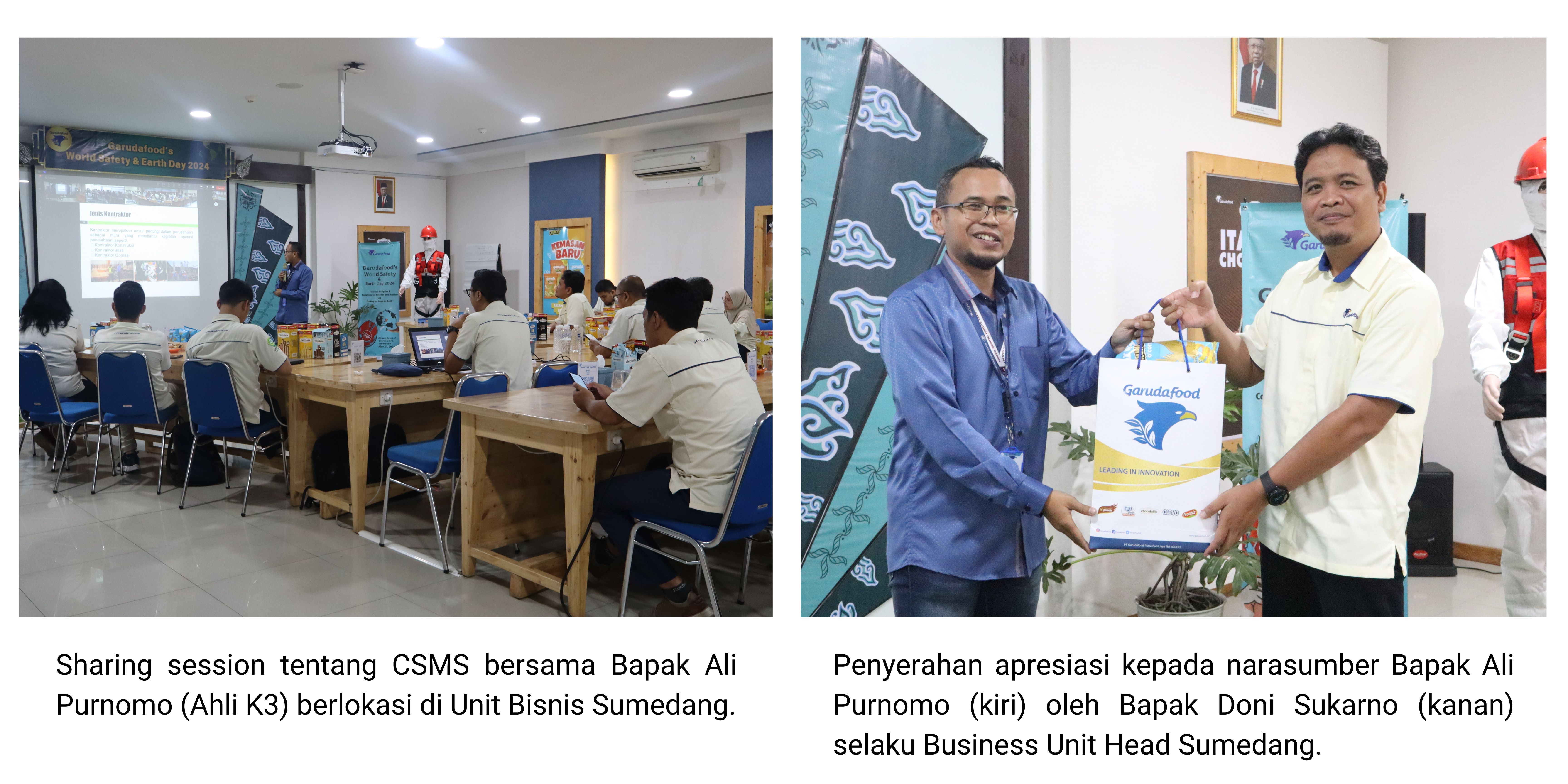 Acara ini sekaligus memperingati Hari K3 Nasional yang jatuh pada tanggal 12 Januari sampai dengan 12 Februari 2024, World Earth Day yang jatuh pada tanggal 22 April 2024 serta World Safety Day yang jatuh pada tanggal 28 April 2024. Pada kesempatan ini, Garudafood mengundang Ahli K3 yaitu Bapak Ali Purnomo untuk memberikan insight tentang Contractor Safety Management System (CSMS). Tujuannya agar karyawan dapat bersama-sama memastikan bahwa kontraktor-kontraktor yang bekerja di lingkungan perusahaan telah memenuhi standar dan kriteria K3L yang ditetapkan Perusahaan.