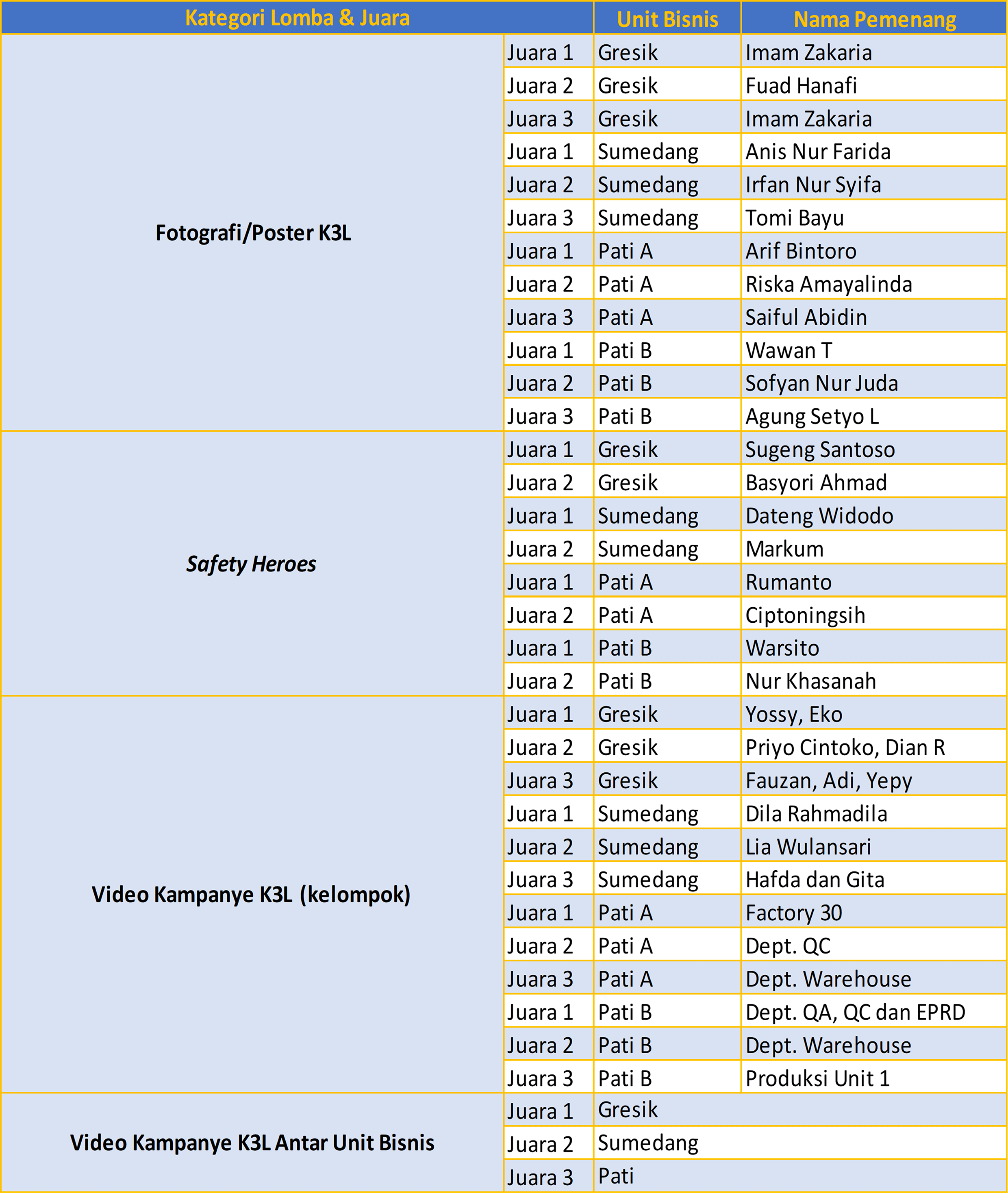Dari kiri atas, searah jarum jam: Foto Bersama BU Head dan Para Pemenang Lomba K3L dari Unit Bisnis Sumedang, Unit Bisnis Pati (A), Unit Bisnis Gresik, dan Unit Bisnis Pati (B)