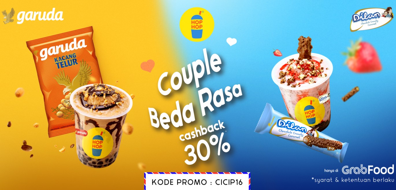 Kolaborasi Garudafood dan Hop Hop Bubble Drink Indonesia meluncurkan minuman dari GARUDA KACANG TELUR dengan varian Cappucino Nougat dan Strawberry Nougat serta minuman DILAN dengan varian Choco Dilan, Strawberry Dilan dan Cappuccino Dilan.