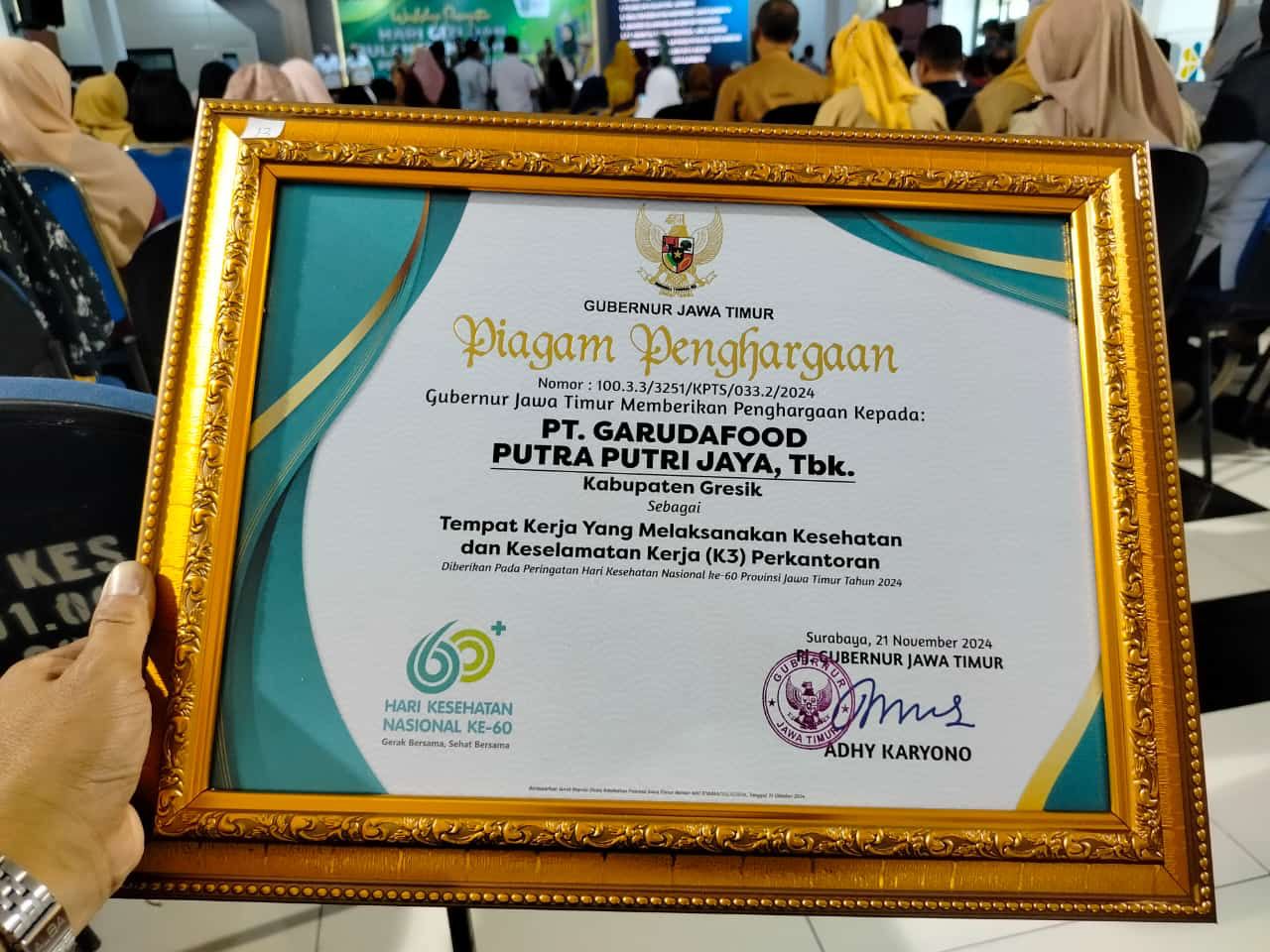 Penghargaan yang diterima Garudafood berupa Sertifikat Tempat Kerja yang Melaksanakan Kesehatan dan Keselamatan Kerja (K3 Perkantoran). Sertifikat tersebut diterima oleh Bapak Ardiyanto Happy Susilo, SHE Section Head Garudafood BU Gresik, yang menunjukkan komitmen perusahaan terhadap aspek kesehatan dan keselamatan kerja di lingkungan perkantoran.