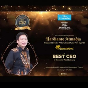 The Iconomics menetapkan Bpk. Hardianto Atmadja, Presiden Direktur PT Garudafood Putra Putri Jaya Tbk (GOOD) sebagai penerima penghargaan Indonesia Best CEO in Consumer Food INDONESIA BEST CEO AWARD 20222 “Employees Choice 3rd Anniversary” Award 2022.