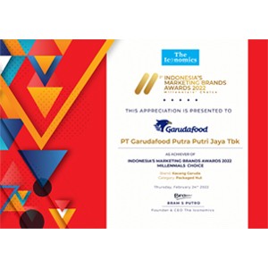 Jakarta, 24 Februari 2022 - Untuk ke-2 kalinya The Iconomics Research Consulting menetapkan PT Garudafood Putra Putri Jaya Tbk untuk Kategori Kacang Kemasan Merk Kacang Garuda sebagai Penerima Penghargaan “2nd Indonesia Marketing Brands Awards (Millennials’ Choice)”.