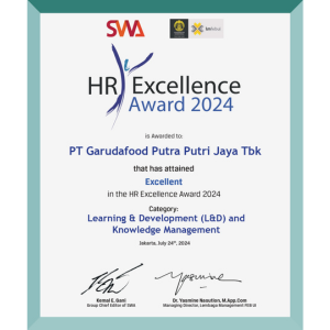 Jakarta, 24 Juli 2024 – PT Garudafood Putra Putri Jaya Tbk (Garudafood) kembali menorehkan prestasi di ajang HR Excellence Award 2024. Dengan mengangkat tema “Building Agility and Work Experience Towards Future-Ready Organization”, SWA bekerja sama dengan LM-FEB UI menggelar penghargaan bergengsi ini untuk ke-15 kalinya. Penghargaan HR Excellence Award merupakan bentuk apresiasi yang diberikan kepada perusahaan-perusahaan nasional yang memiliki best practices dalam praktik manajemen human capital.