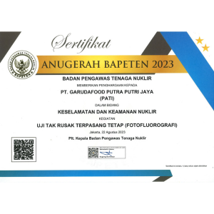 Yogyakarta, 22 Agustus 2023 – PT Garudafood Putra Putri Jaya Tbk - Business Unit (BU) Pati berhasil meraih penghargaan “Anugerah Badan Pengawas Tenaga Nuklir (BAPETEN) 2023” untuk kategori Keselamatan dan Keamanan Nuklir Kegiatan Uji Tak Rusak Terpasang Tetap (Fotofluorografi). Acara Anugerah BAPETEN 2023 diselenggarakan secara hybrid pada Selasa, 22 Agustus 2023 di Hotel Royal Ambarrukmo, Yogyakarta.