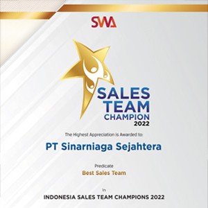 PT SINARNIAGA SEJAHTERA (SNS) untuk pertama kalinya raih penghargaan Sales Team Champions Award 2022 dengan Predikat: BEST SALES TEAM yang diberikan oleh Majalah SWA dan Business Digest.