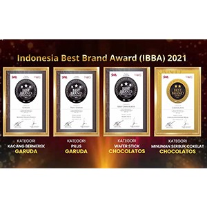 Jakarta, 25 November 2021 - Garudafood kembali meraih meraih 4 (empat) penghargaan Indonesia Best Brand Award (IBBA) 2021 melalui 2 (dua) Brand unggulannya yaitu Garuda dan Chocolatos. Penghargaan ini merupakan apresiasi terhadap merek-merek terbaik di tanah air sebagai tolak ukur kinerja merek Indonesia, khususnya di masa pandemi Covid-19 dengan memperhatikan lima variabel penilaian yakni awareness, iklan, brand usage, satisfaction, dan loyalty yang menghasilkan suatu brand value index.