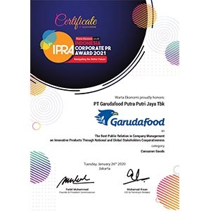 PT Garudafood Putra Putri Jaya Tbk (GOOD) dengan slogannya "Leading In Innovation" kembali menorehkan prestasi dengan menerima penghargaan yang diberikan oleh WartaEkonomi.co.id Research sebagai “The Best Public Relations in Company Management on Innovative Products Through National and Global Stakeholders Cooperativeness” dalam ajang Indonesia Public Relations Award (IPRA) 2021.