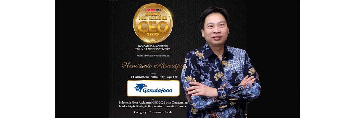 Jakarta, 16 Desember 2022 - WartaEkonomi.co.id Research and Consulting kembali menetapkan Hardianto Atmadja (Presiden Direktur PT Garudafood Putra Putri Jaya Tbk) sebagai penerima penghargaan: Indonesia Most Acclaimed CEO 2022 dengan tema Navigating Innovation to Lead a Success Strategy untuk kategori: Indonesia Most Acclaimed CEO 2022 with Outstanding Leadership in Strategic Business for Innovative Product, (Category: Consumer Goods). Penghargaan ini merupakan yang ke-6 kalinya diterima oleh Bpk. Hardianto sejak tahun 2016.