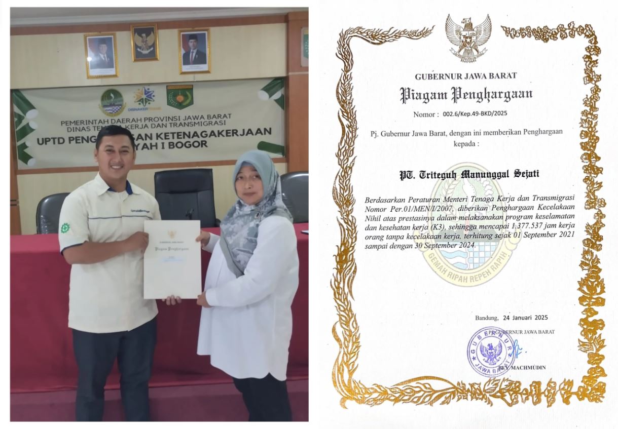 Bogor, 26 Februari 2025 - PT Triteguh Manunggalsejati (TRMS) Bogor yang merupakan perusahaan manufaktur sekaligus anak perusahaan Garuda Beverage Sukses (GBS) meraih dua penghargaan prestisius dari Gubernur Jawa Barat, yaitu penghargaan zero accident (kecelakaan nihil) dan penghargaan Panitia Pembina Keselamatan dan Kesehatan Kerja (P2K3) periode 2024.